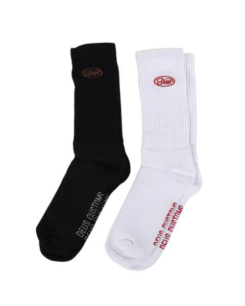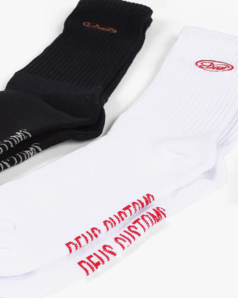 Pack com duas meias de cano médio com bordado exclusivo nas laterais e detalhes escritos em jacquard na parte inferior.